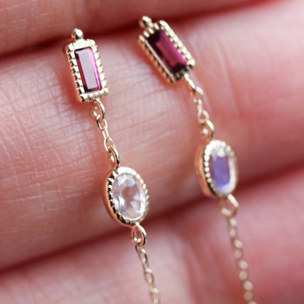 ロードライトガーネット / ロイヤルブルームーンストーン チェーンフープ ピアス | K10YG