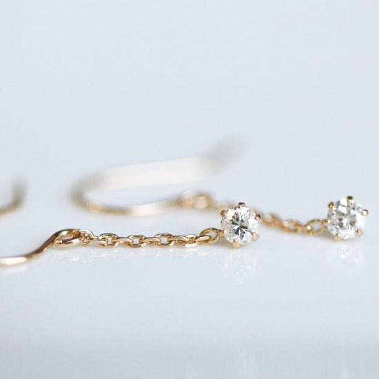 チェーンの先に一石のダイヤモンドが光るフックピアス。