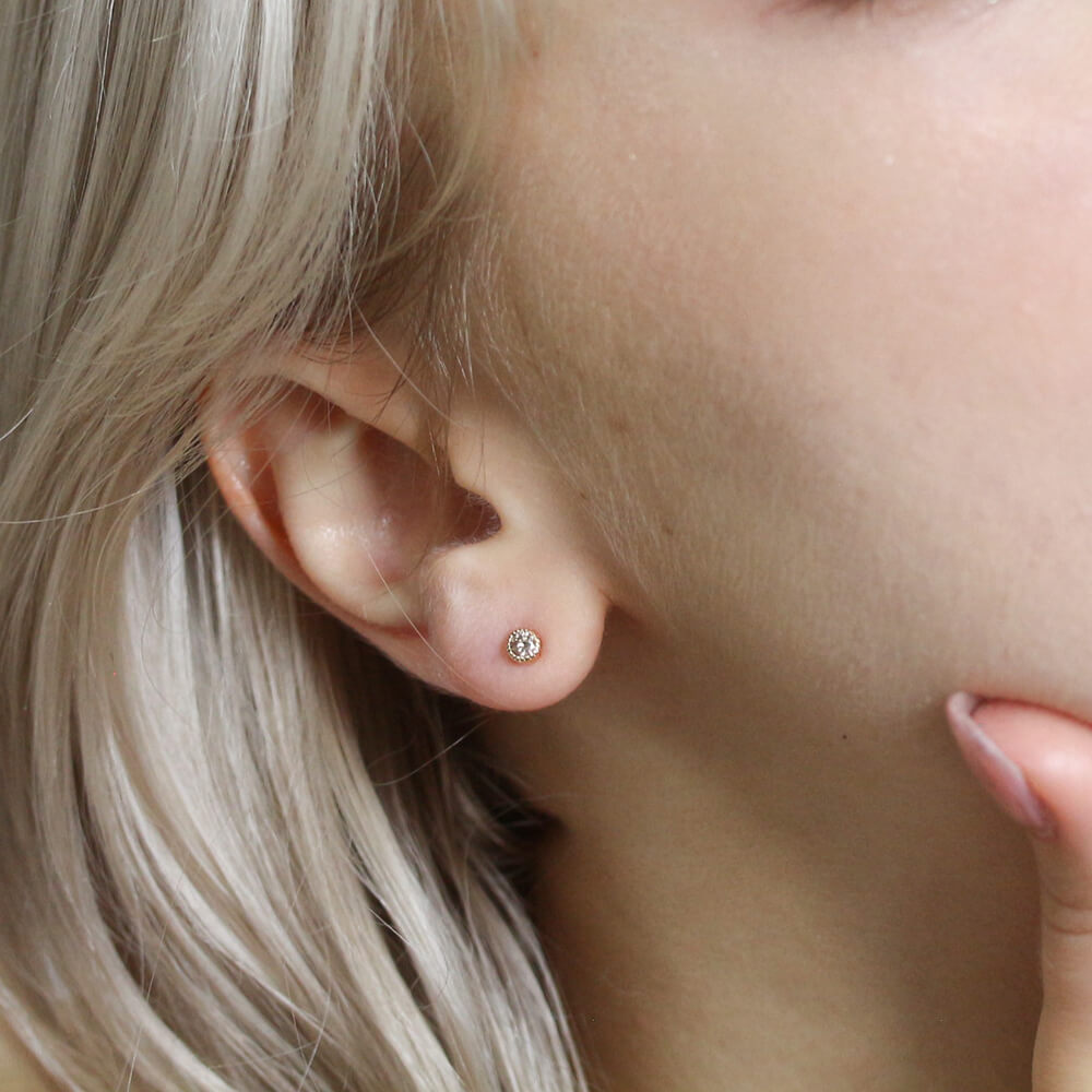 0.2ctのシャンパンダイヤモンドをシンプルにミルグレインの枠で留めたピアス。