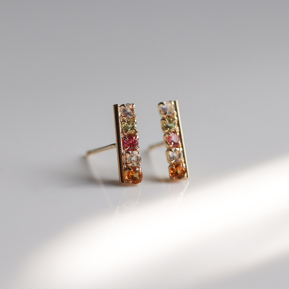 ゴールドのラインに5石のカラーストーンがあしらわれたマルチカラーストーンピアス。